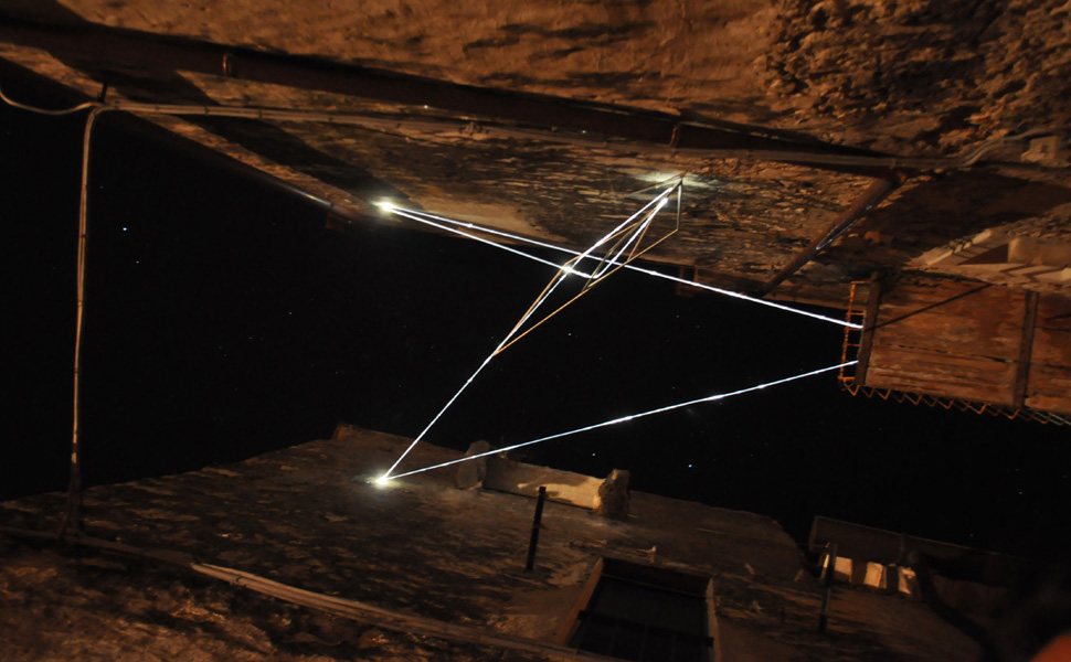 Linee di luce stabiliscono relazioni tra angoli di spazi vissuti. La fibra ottica, come veicolo di luce e relazione, congiunge i punti e ferisce lo spazio. La luce, incanalata e imprigionata, si mostra come mezzo per evidenziare lo spazio quale ‘disegno mentale’, che sfrutta non la superficie ma lo spazio totale e il buio come un foglio scuro sul quale strutturarsi in negativo.